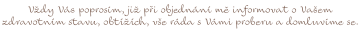 Storno prosím nejpozději 24 hodin dopředu – pozdější storna termínů nebude na ně brán zřetel, taktéž bez další možnosti objednání se. Děkuji, že respektujete moji práci a čas.